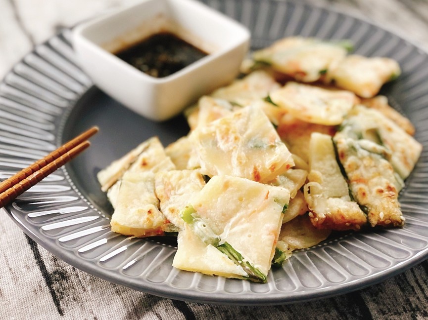 說到煎餅許多人會想到韓式的海鮮煎餅,外皮有點酥脆,包裹著海鮮、泡菜與許多蔬菜,直接單做一餐吃就營養十足、很有飽足感。此份食譜因為只使用中筋麵粉,所以口感比較軟。若要做出韓式的酥脆感,可以加入在來米粉,且煎的時候要放比較多油,在半煎半炸之下煎餅才會有比較堅硬酥脆的外皮。而且煎完以後,最好放在有許多孔洞的架子上散熱,才不會因為水蒸氣而影響口感。