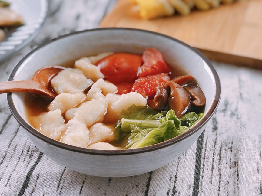 4. 湯煮滾後加入麵疙瘩、小白菜,續滾約 1 分鐘即完成。