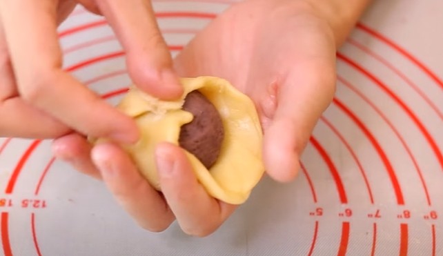 將靜置完成、捲成蛋捲狀的油酥皮取出,並以食指從其中間往下壓,再以食指與大拇指從其兩側(呈螺旋狀處)往中間輕壓,接著將整體壓扁,並以桿麵棍將其桿成圓形餅皮狀。待餅皮皆完成,即可取出包覆好蛋黃的豆沙餡,放置於餅皮中間,並將其完整包好、滾成圓球。
