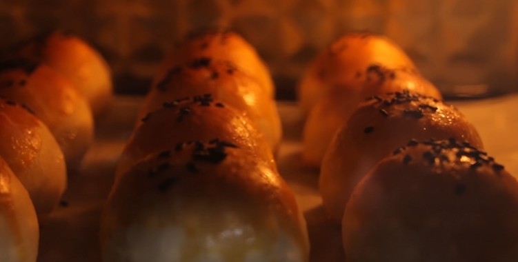 將包好的蛋黃酥放置於烘焙紙上,接著將蛋黃液與1小匙牛奶混合均勻,並塗抹於蛋黃酥表面,最後撒上少許芝麻,等待約5~10分鐘,讓蛋黃液乾燥後即可進烤箱烘烤。而在等待期間,可先將烤箱調整成180度預熱,預熱完成後放入蛋黃酥,烤約30~40分鐘,香噴噴的蛋黃酥就出爐啦!