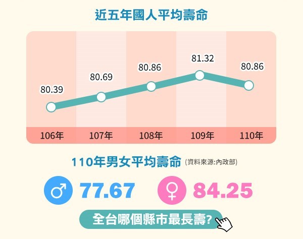 內政部公布110年國人平均壽命為80.86歲,其中男性77.67歲、女性84.25歲,為歷年次高水準,也都高於全球平均壽命,男、女性平均壽命分別高於全球平均水準7.5歲及9.3歲,從長期來看是呈現上升趨勢,由100年79.15歲增至110年80.86歲。不過,台灣預計2025年預計邁入超高齡社會,受人口老化影響,110年國人死亡人數為18萬4,457人,較109年增加1萬1,295人。