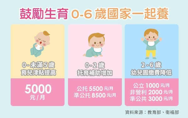 「經濟負擔」可能是大多數人考慮生育的一大問題,政府的生育政策今年8月有做新調整,落實「0-6國家一起養」的理念,育兒津貼再加碼,每個月從3,500元提升至5,000元,第2、3胎都有加發;此外,公立、非營利、準公共幼兒園學費降低至3000元以下,且公托名額也將再增加,讓家長育兒更無負擔。