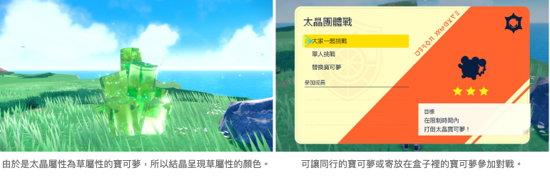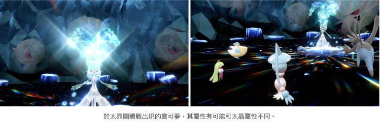 觸碰光耀生輝的結晶,即可挑戰太晶團體戰。結晶的外觀如同寶石,其顏色會與太晶寶可夢的太晶屬性一致。而且,結晶還會朝向天空發出閃亮的光柱,所以從遠處也能發現。