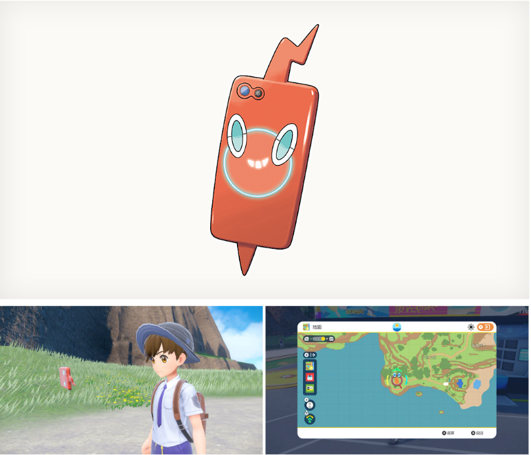 在帕底亞地區冒險時不可或缺的「手機洛托姆」,配備了許多能在旅途中派上用場的 App 和功能,非常方便。除了本作的「寶可夢圖鑑」會以 App 的形式內建於「手機洛托姆」之外,手機洛托姆中還備有「地圖 App」。「地圖 App」中登錄了帕底亞地區全境的地圖,不僅能用來確認自身當下的位置,還能確認附近的城鎮或寶可夢中心的位置,以及出現在周圍的野生寶可夢等多項資訊。