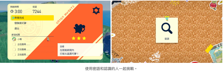 玩家可以主動招募成員,或參加正在招募成員的團體戰。和全世界的訓練家同心協力,一起挑戰太晶團體戰吧。只要使用網路通訊,就能參加世界各地正在招募成員的太晶團體戰,或主動招募訓練家。