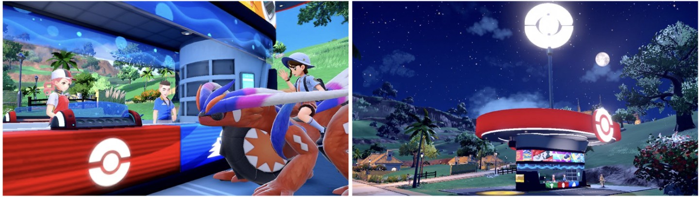在帕底亞地區廣大的場地上冒險並非易事。旅途中將會不斷地和寶可夢訓練家對戰,或是捕捉野生的寶可夢,因此中間少不了要幫寶可夢們回復活力,並且取得捕捉寶可夢用的精靈球。散布在帕底亞地區的多處室外型設施「寶可夢中心」,就是這些寶可夢訓練家可靠的據點。「寶可夢中心」的上方有著醒目的精靈球標誌。這個標誌在夜裡會點亮,讓寶可夢訓練家們即使從遠處也容易找到它。