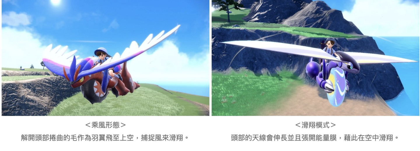 玩家可以乘著傳說的寶可夢,和牠在遼闊的帕底亞地區一起冒險到各個角落。全速奔馳在大草原或沙漠中,自由自在地在水面上前進,攀上崖壁,翻過山丘,從山頂上一躍而下滑翔出去 —— 盡情享受開放世界既暢快又自由的冒險。和傳說的寶可夢一起邂逅各式各樣的寶可夢和人們,揭開等待在冒險前方的帕底亞地區之謎吧。
