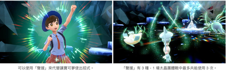 「聲援」共有 3 種,除了可以提升攻擊和特攻,或提升防禦和特防之外,還可以進行回復,且我方全體都能受到聲援的效果。不論是誰都能使用「聲援」,因此就算自己的寶可夢沒有學會輔助其他寶可夢的招式,也能輕鬆地和夥伴合作。通力合作是在太晶團體戰獲勝的關鍵。運用「聲援」帶領夥伴迎向勝利吧!