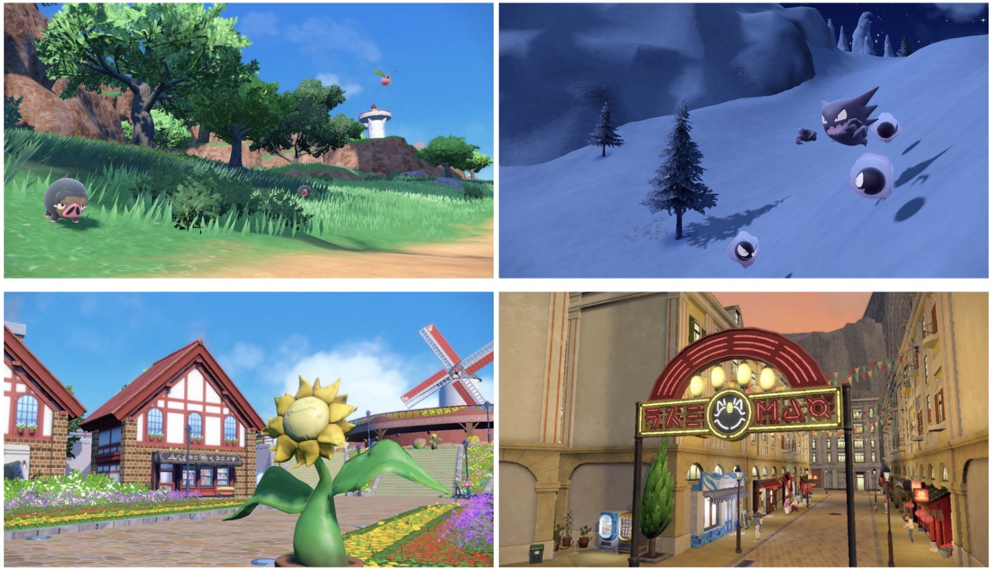 冒險舞台「帕底亞地區」由高聳的山脈,以及湖泊、荒野和險峻的山岳地帶等景觀構成一片連綿不絕的壯闊大地。形形色色的訓練家在其中冒險,並且磨練著寶可夢對戰的本領。在農業興盛的村莊或擁有繁榮市場的港鎮等各種地方,都有人類和寶可夢生活著。此外,寶可夢們也棲息在樹木上、河川裡等大自然的種種角落,等待著和玩家們相遇。
