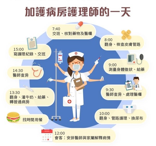 醫院的護理師分為三班制排班:白班、小夜班、大夜班,,一天24小時除以三,一班大約8小時,大、小夜班各有不同鐘點費加給,每個班別的開始和結束都是在交接班,故提早上班、延後下班,每天的工時常超過8小時,以高壓的加護病房為例,交班會交接病人入院經過、做過的檢查、目前用藥及治療計劃、生命徵象,而每天例行事項有翻身(2小時一次)、拍痰等基本照護,給藥、管路護理、身體徵狀評估、檢查、執行醫囑、寫護理紀錄,皆需要護理專業,面對病人病況惡化,需放下手邊工作馬上急救,工作一忙碌護理師們時常犧牲吃飯時間。