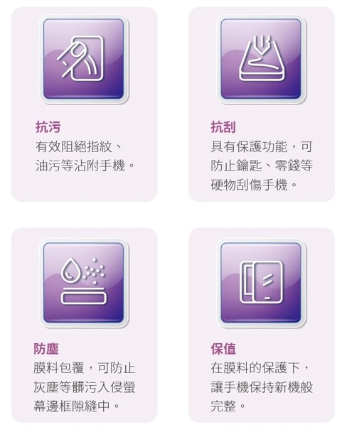 包膜就像是為手機披上一層保護外衣,主要提供抗污、抗刮以及防塵功能。因為只有一層薄薄的膜,所以拿起來的手感,基本上與裸機無異,廣受「裸機派」的喜愛。手機包膜具備以下特點,讓你可以在使用手機時更加放心: