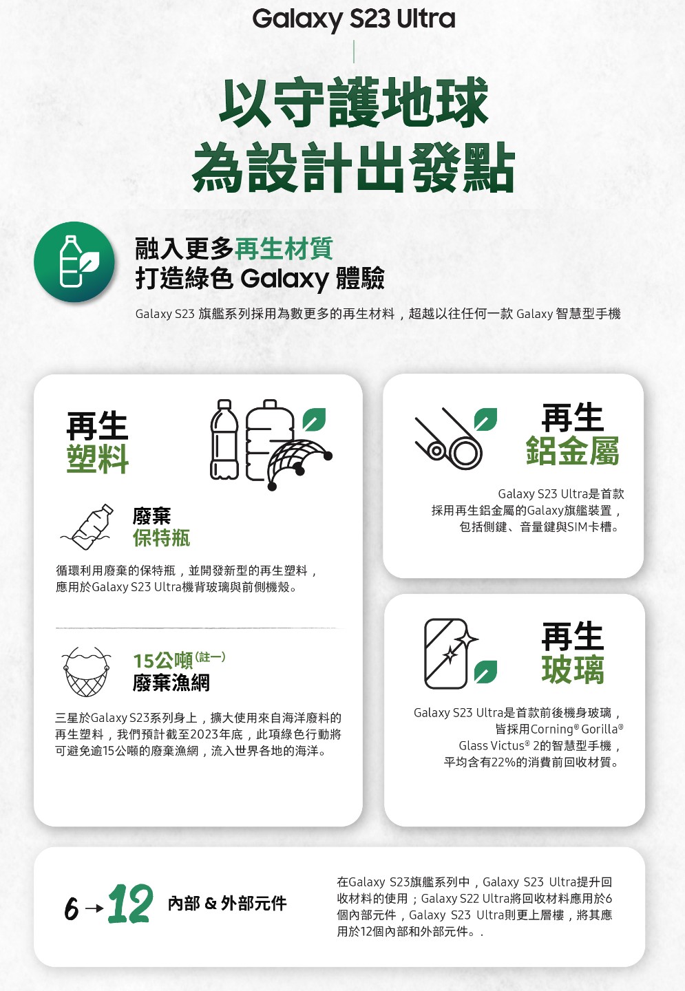 三星Galaxy S23旗艦系列手機,強打永續環保的精神,台灣三星電子行動通訊事業部總經理陳啓蒙表示,三星持續推動以科技創造更綠色永續的生活型態,積極打造堅固耐用的裝置,新科技與工藝設計,不僅能延長產品的使用壽命,並在產品生命周期的每一個階段,將「永續」納入考量,發展對環境影響最低的先進技術。這次最頂規的Galaxy S23 Ultra手機,也將永續概念發揮得淋漓盡致,以守護地球為設計出發點,將新創永續的材質,應用於12個內部和外部元件。
