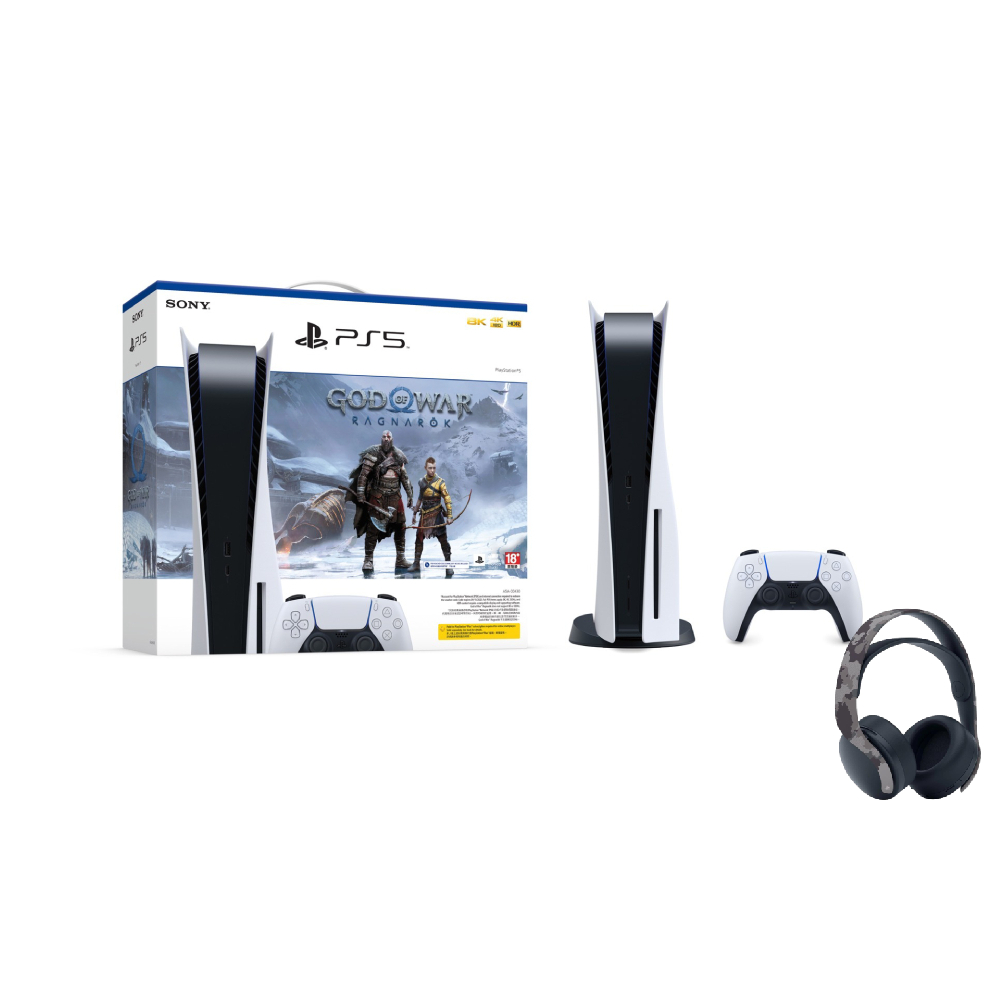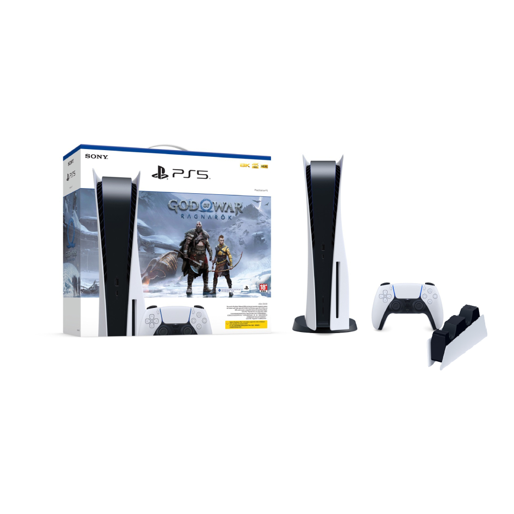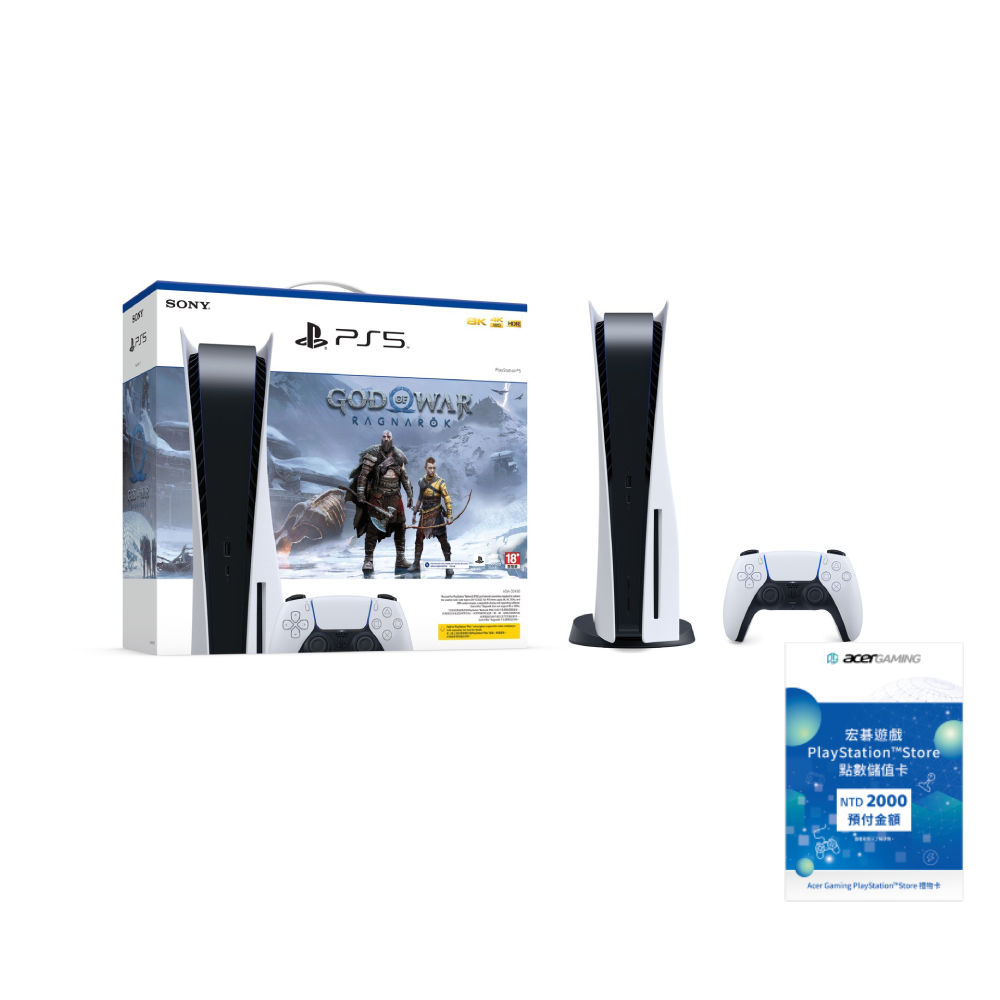 PS5光碟版主機、DualSense 無線控制器、底座、HDMI連接線、交流電源線、USB連接線、說明書、A S TRO’s PLAYROOM、PS5遊戲God of War Ragnarök兌換券(中英韓文版)