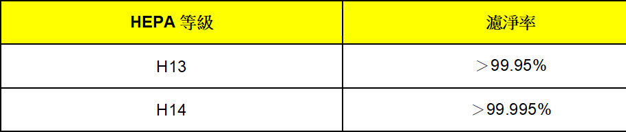 目前根據美國能源部定義之HEPA等級共有H13與H14,其「濾淨率」分別如下:
