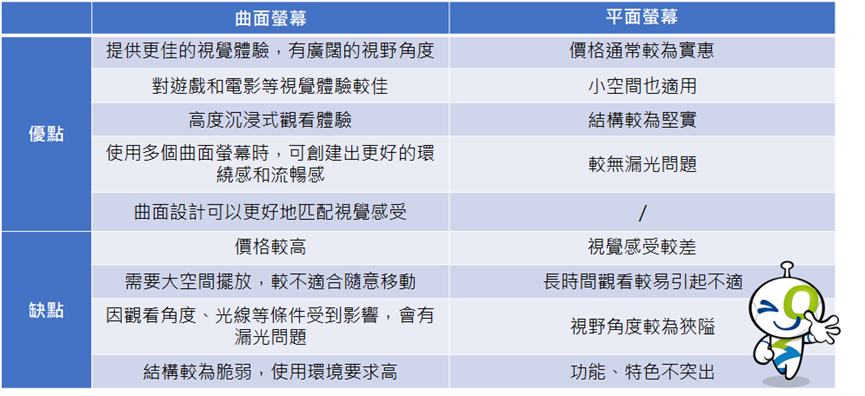 大家最常看到的螢幕,大多為平面螢幕。舉例來說:辦公室電腦螢幕、文書筆電等等,僅用平面螢幕就已經足夠提供使用。但對於遊戲玩家來說,想要看到全景畫面則需要左右轉動肩頸,才能夠看到充足的視野,而在這短短的幾秒鐘之間可能就會造成遊戲體驗不佳。因此,若僅為文書處理的話,平面螢幕就可以;但若是想要有更高端的體驗,則不建議選購平面螢幕。