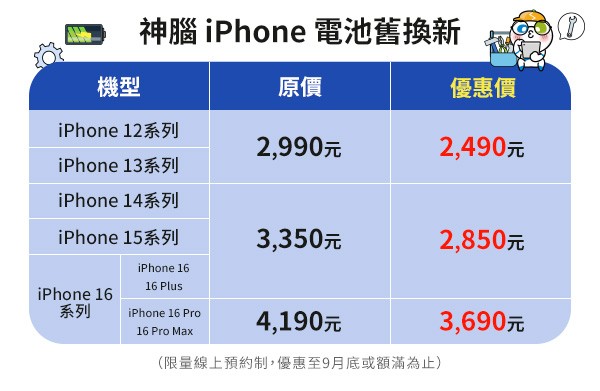iPhone電池平均使用兩年便開始出現耗損,若有換原廠電池或螢幕、邊框等有維修需求的朋友,2025/8/1起,親送至全台7間神腦Apple原廠授權維修中心,iPhone 電池舊換新優惠,最高優惠800元,iPhone 12~16 系列現折500元,完修後加贈配件購物金300元。詳情請見神腦Apple原廠授權維修中心。以下為本波限定優惠內容:
