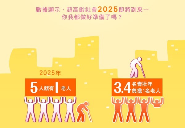歲月增長、逐漸老化是你我都必經的人生歷程,人在進入年邁階段時,不免會遇到種種問題,像是健康衰退、經濟負擔、長期照護等,生活起居各方面都會與青壯年時期有很大的差異。台灣出生率低是世界聞名,且一年比一年低,人口結構組成的改變,使得台灣在2018年時已經進入高齡社會(老年人口占總人口14%),緊接著預估將在2025年進入超高齡社會(老年人口占總人口20%),也就是說在路上看到每5人有1人就是65歲以上老年人,而每3.4名青壯年,要養1名老人。國發會預估2040年扶老比會提升到50%,等於說2名青壯年要養1位老人,負擔會越來越重,面對不久的未來,社會出現大量高齡照護需求,每人都為自己該先妥善規劃好。