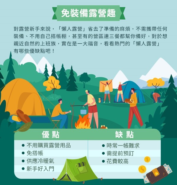 對於露營新手來說,「懶人露營」這種方式,大大節省了準備的麻煩,只要備好隨身行李,不需要花錢購買裝備,或是租用、搬運任何露營裝備,也不需要自己搭帳棚,甚至有的露營區連三餐都幫你備好好,還可以選擇喜歡的風格帳篷,像是超美神殿帳、機動露營車、蒙古包等,對於想親近自然的上班族,實在是一大福音,輕鬆就能體驗野外生活的悠閒愜意,來看看時下最熱門的「懶人露營」有哪些優缺點吧!