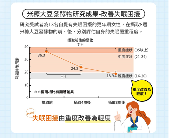 實驗顯示,多位自覺有失眠困擾的更年期女性,在持續攝取好眠多酚CELABIO®-F 8 週後,顯著改善了失眠困擾,失眠程度由原先的重度改善為輕度。