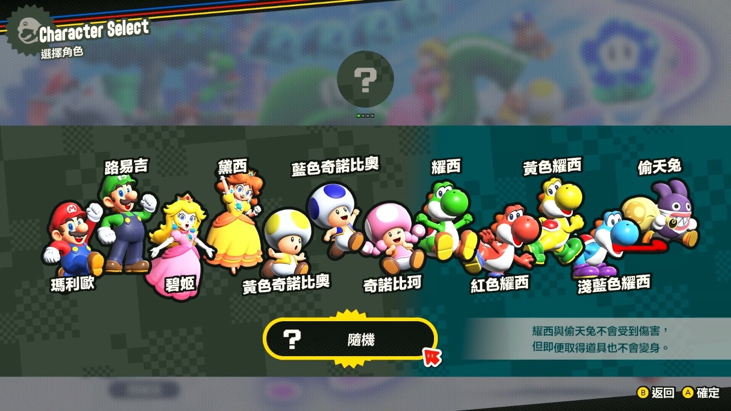《超級瑪利歐兄弟 驚奇》準備了瑪利歐、路易吉、碧姬、黛西、奇諾比奧(黃色 / 藍色)、奇諾比珂、耀西(綠色 / 紅色 / 黃色 / 淺藍色)、偷天兔共 12 名可操作角色,可操作總數為系列最多。
