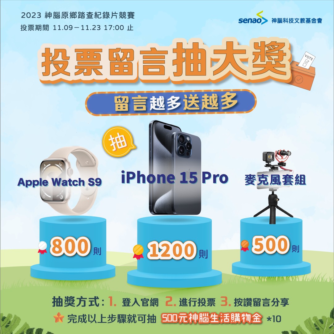 最有人氣紀錄片獎由你決定!每人每天至多可投三票給喜愛的影片,並完成投票三步驟,就有機會免費抽iPhone 15 Pro(128G)、Apple Watch S9、Rode Vlogger直播麥克風套組等大獎帶回家,票選活動限時兩週,趁現在有空就趕快來投票,參加免費iPhone抽獎!