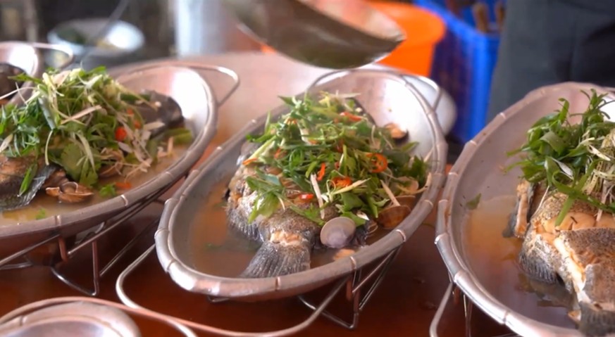 ►清蒸魚:在辦桌常見到清蒸魚,像是豆酥鱈魚或是鱸魚。以新鮮的魚類為主角,加入薑絲、蔥段和米酒等調味料,蒸煮而成。