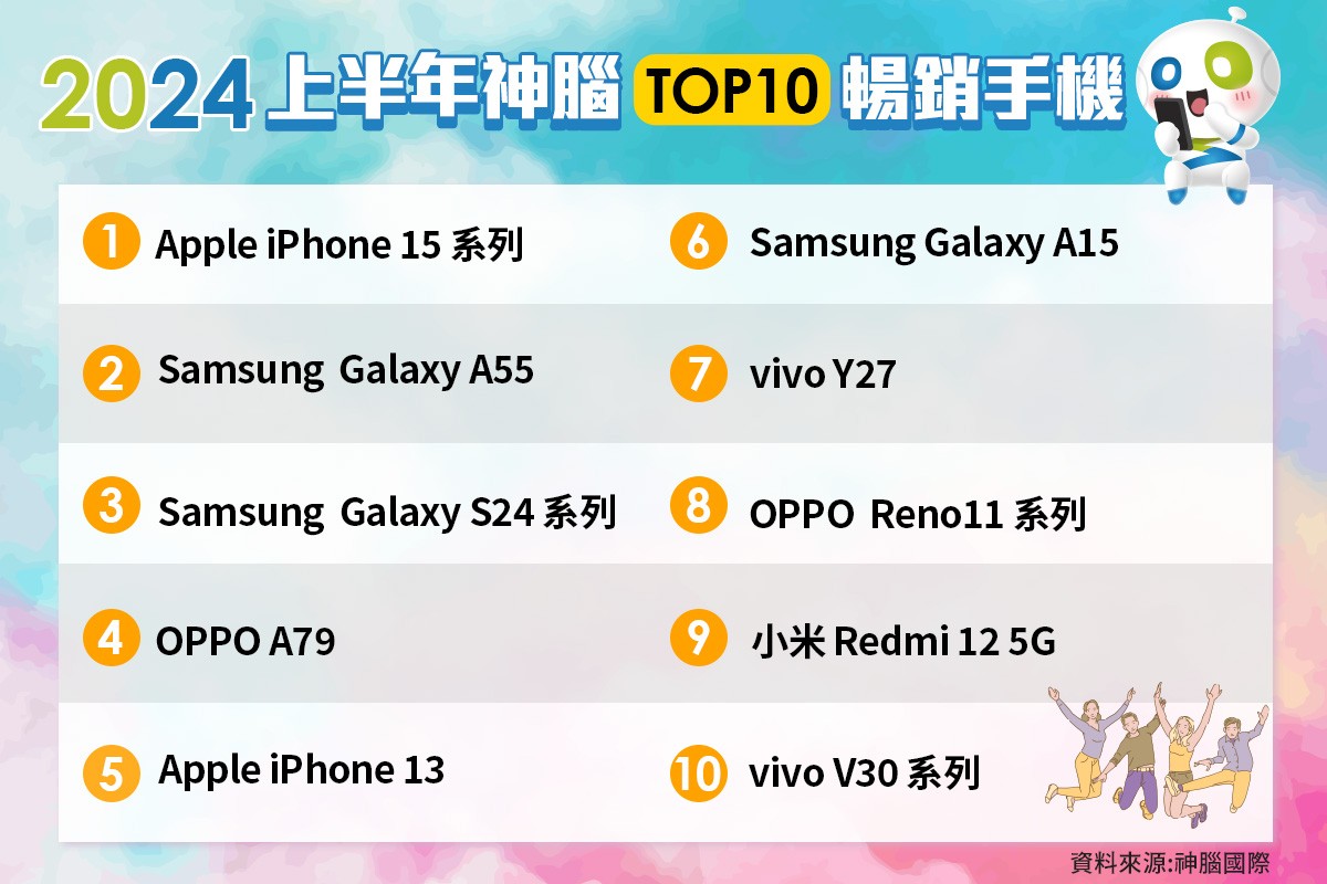 神腦公布2024上半年全通路「前十大暢銷手機」,iPhone 15 系列登上暢銷冠軍,第2~3名分別是三星Galaxy A55及S24系列、第4名是OPPO的平價機A79、第5名是 iPhone 13,第6~10名依序是三星Galaxy A15、vivo Y27、OPPO Reno 11系列、小米 Redmi 12 5G、vivo V30系列。值得注意的是,2021年上市的iPhone 13被消費者認為是最好用的神機,歷經 iPhone 14、15系列的推出,在市場上仍受到消費者的青睞,有著亮眼的銷售成績。高階機種較多民眾選擇「iPhone 15 系列」及主打AI的「三星Galaxy S24系列」,中階機種則最多人買一萬五內的「三星Galaxy A55」,初階機種則是「OPPO A79」為最熱門。