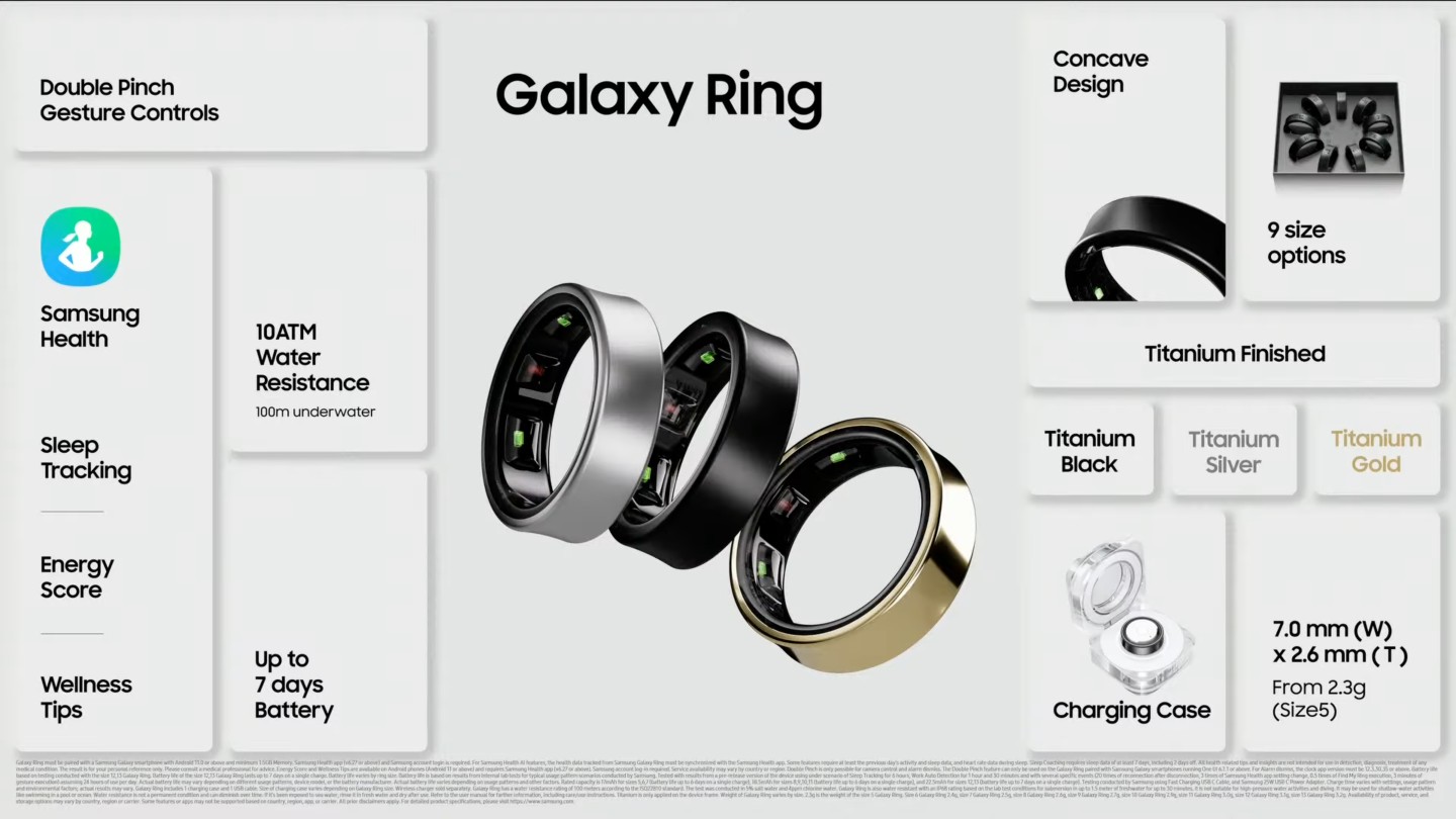 三星這次還推出了全新的穿戴裝置 Galaxy Ring。Galaxy Ring 採用簡潔設計,重量僅 2.3 克至 3.0 克,質地輕盈,即使長時間配戴也能保有舒適度。它具備 10ATM 防水效能和五級鈦表面處理,在任何場合配戴都能安心自在。