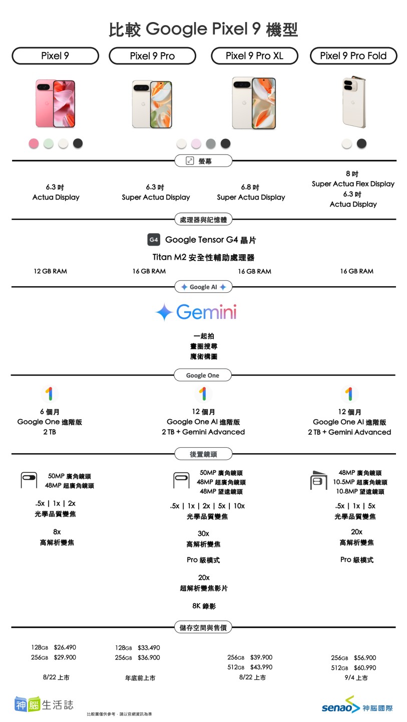 Google 於 8/14 在台灣正式發表全新 Pixel 9 系列手機,包括 Pixel 9、Pixel 9 Pro、Pixel 9 Pro XL 以及摺疊手機 Pixel 9 Pro Fold。這次新品不僅帶來全新外型設計和硬體升級,更透過最新的 Tensor G4 晶片,提供更強大的 AI 功能體驗。