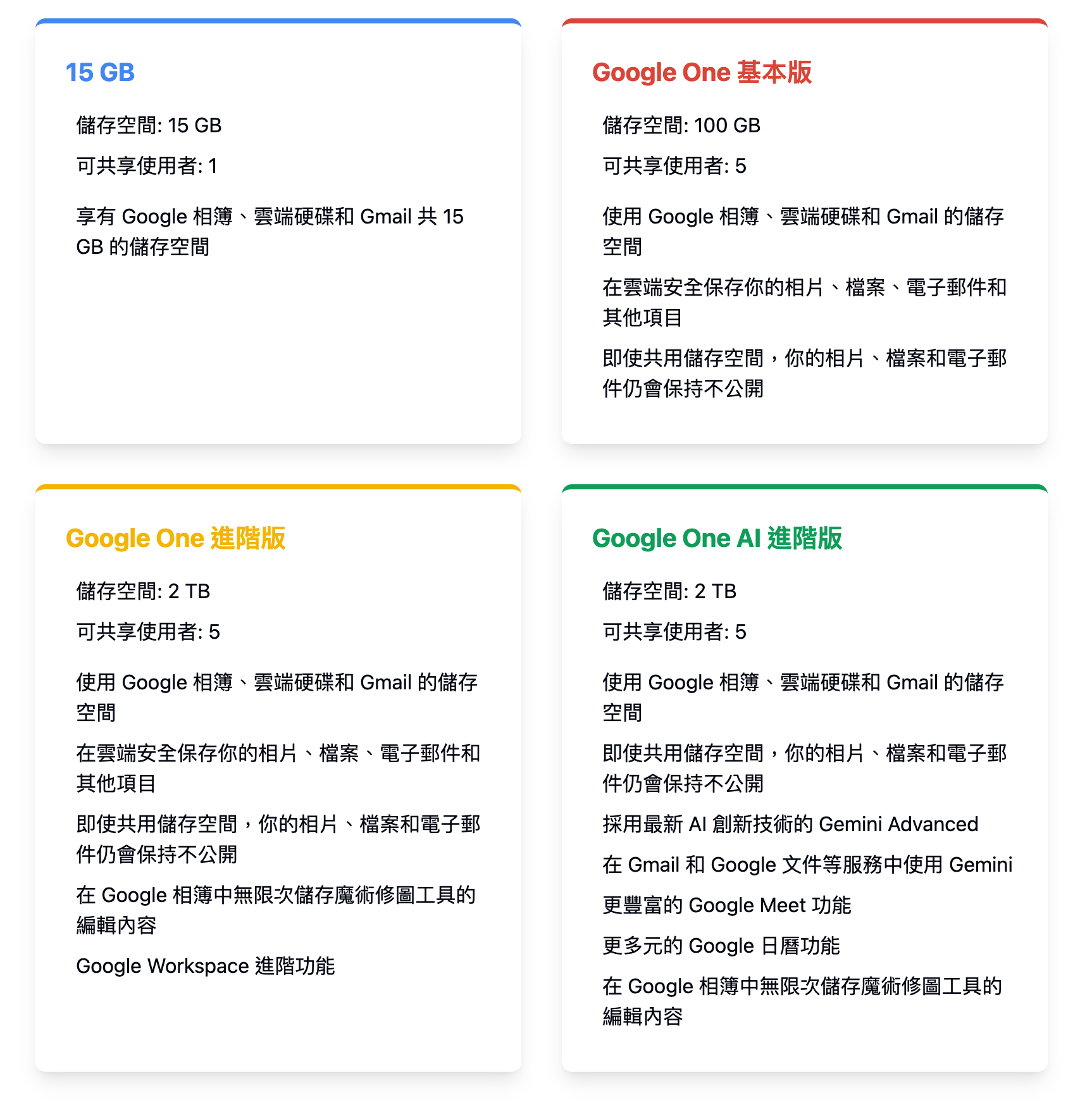 現在就開始評估你的需求,選擇最適合你的 Google One 方案吧!無論是從免費升級到基本版,還是直接選擇 AI 進階版,Google One 都將為你的雲端生活帶來前所未有的便利與驚喜!