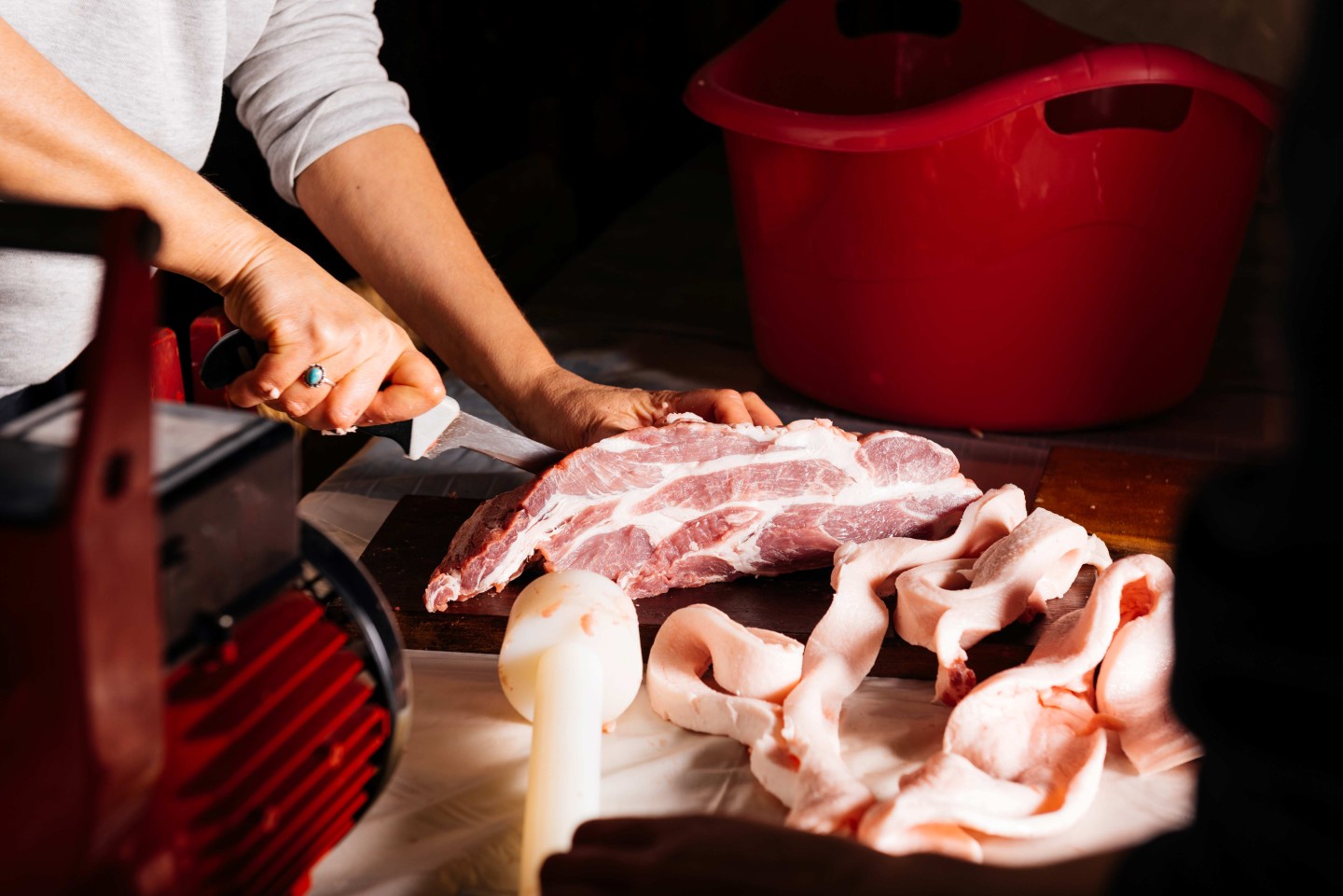 豬頸肉,又稱松阪肉或雪花肉,每頭豬僅有兩小片。這部分的肉油花分布均勻,口感Q彈脆爽,非常適合用來燒烤、煎炒或汆燙,風味十足。位於上肩的梅花肉則富含豐富的油花,非常適合用於燒烤或汆燙。胛心肉肉質軟嫩,適合絞碎後製作成肉餡,也可以切成肉絲爆炒,或切片涮煮。豬腹脇部位的肉脂肪層豐富,間隔著肌肉,因為肥瘦相間,又稱為五花肉或三層肉,非常適合用於長時間的燉滷或紅燒料理。至於豬腳,因為皮厚且富含筋腱,特別適合用來燉煮。