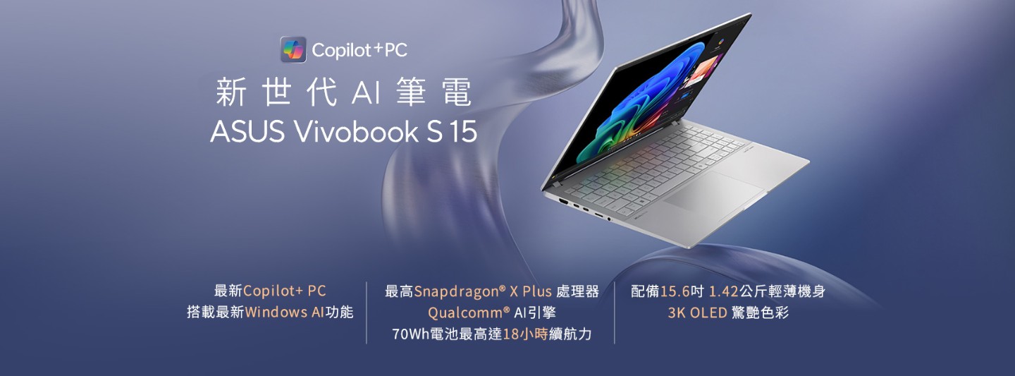 知名電腦品牌ASUS推出新世代AI筆電Vivobook S 15 (S5507QA),即日起可搭配中華電信「精采5G方案」享獨家優惠,指定資費購機最低0元起,再送一年原廠延長保固(價值3,000元),詳情請至中華及神腦門市洽詢。「ASUS Vivobook S 15 (S5507QA)」是華碩首款搭載Snapdragon X Plus處理器的Copilot+PC,擁有15.6吋OLED螢幕及Harman Kardon認證音響,輕1.42公斤、薄14.7公釐方便攜帶;搭載專屬Copilot鍵,一鍵快速啟動AI智能助理,解決各式疑難雜症;「即時字幕」在播放外語影像及音訊時即時語音轉為字幕、「AI生圖」輸入文字或圖片指定即可生成各式圖像,而「回顧」功能只需輸入關鍵字,即時查找資料。同時也搭載了華碩獨家AI應用程式StoryCube的裝置,以最智慧、便捷且強大的數位資產管理方式,透過AI排序、編輯管理檔案。
