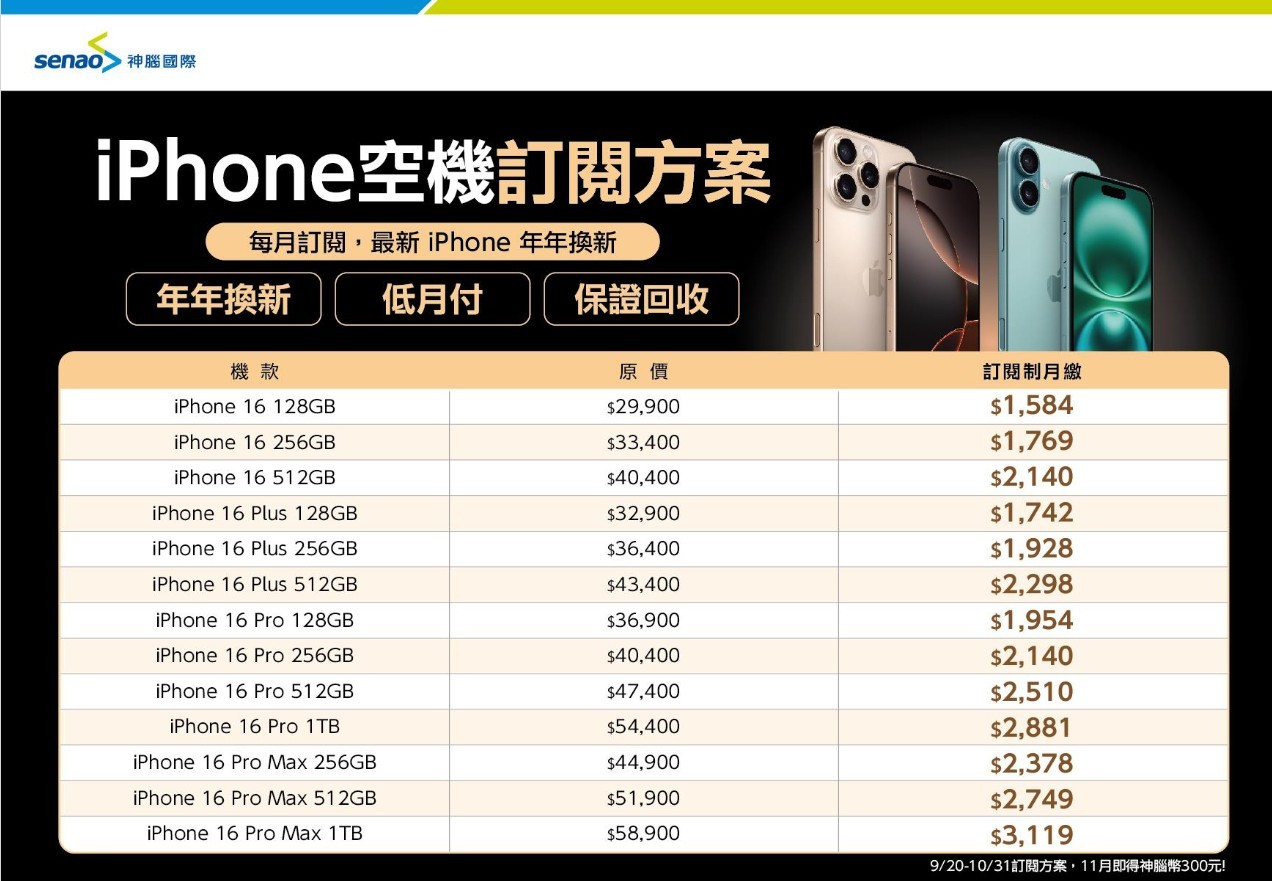 今年神腦推出「iPhone訂閱制」,對口袋預算不多的學生或小資族來說是一大福音,免預繳、不用押金,每月支付最低1,584元就能體驗最新iPhone 16 系列(十月底前訂閱,加送300元神腦幣),挑戰市場訂閱制最低價,同步享有專屬手機保險及維修服務,一年(12期)期滿Apple下代新機推出時,則可以選擇繳回舊機回收,或搭配資費續約訂閱最新一代的iPhone,也能選擇付完尾款直接買斷手機,讓消費者在荷包上的運用更為彈性,訂閱方案詳情請洽全台神腦門市辦理。