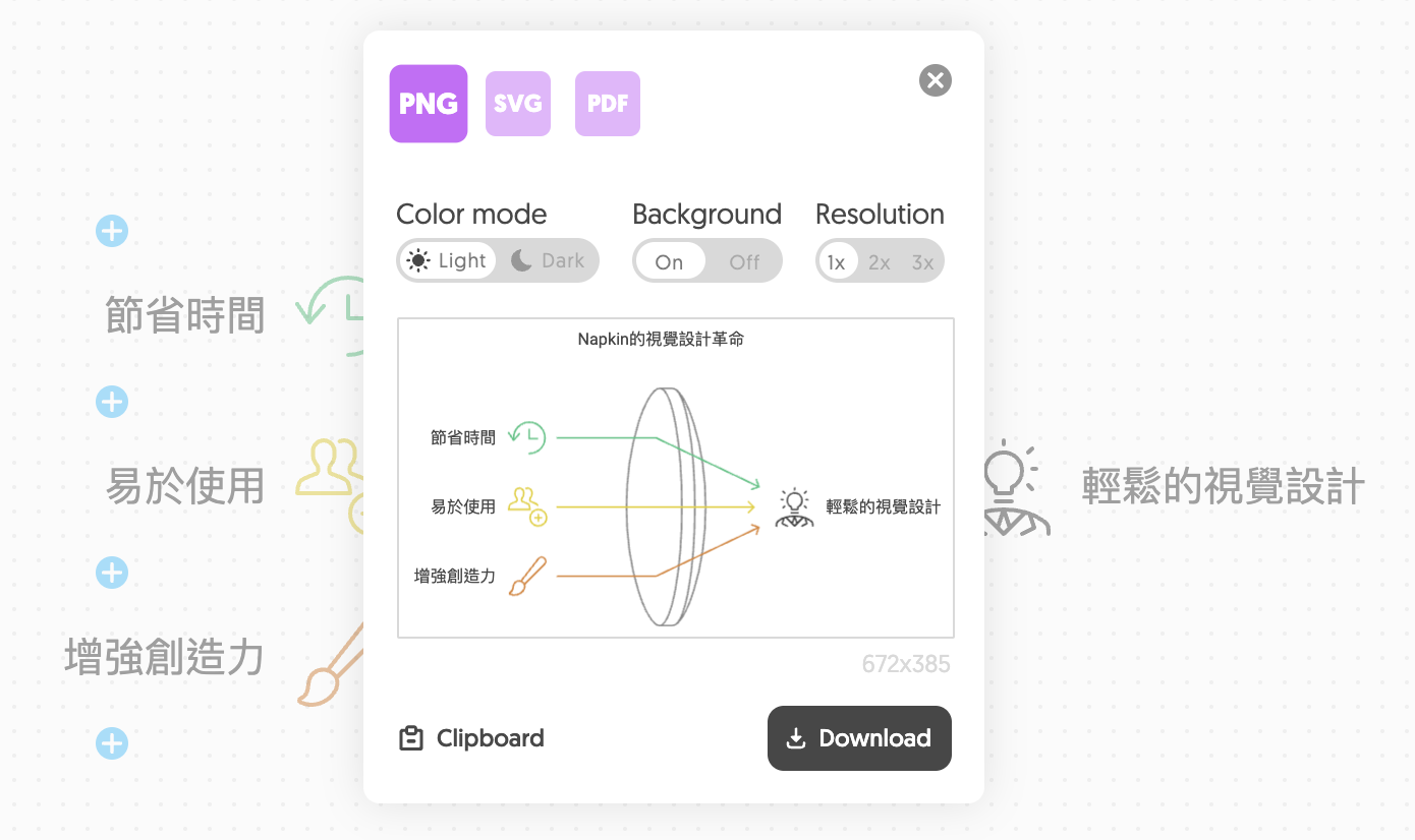 Napkin 也提供了多種匯出格式選項,包括 PNG、PDF 和 SVG。讓你可以輕鬆地將作品應用到各種場景中,無論是簡報、社群媒體,還是專業文件。