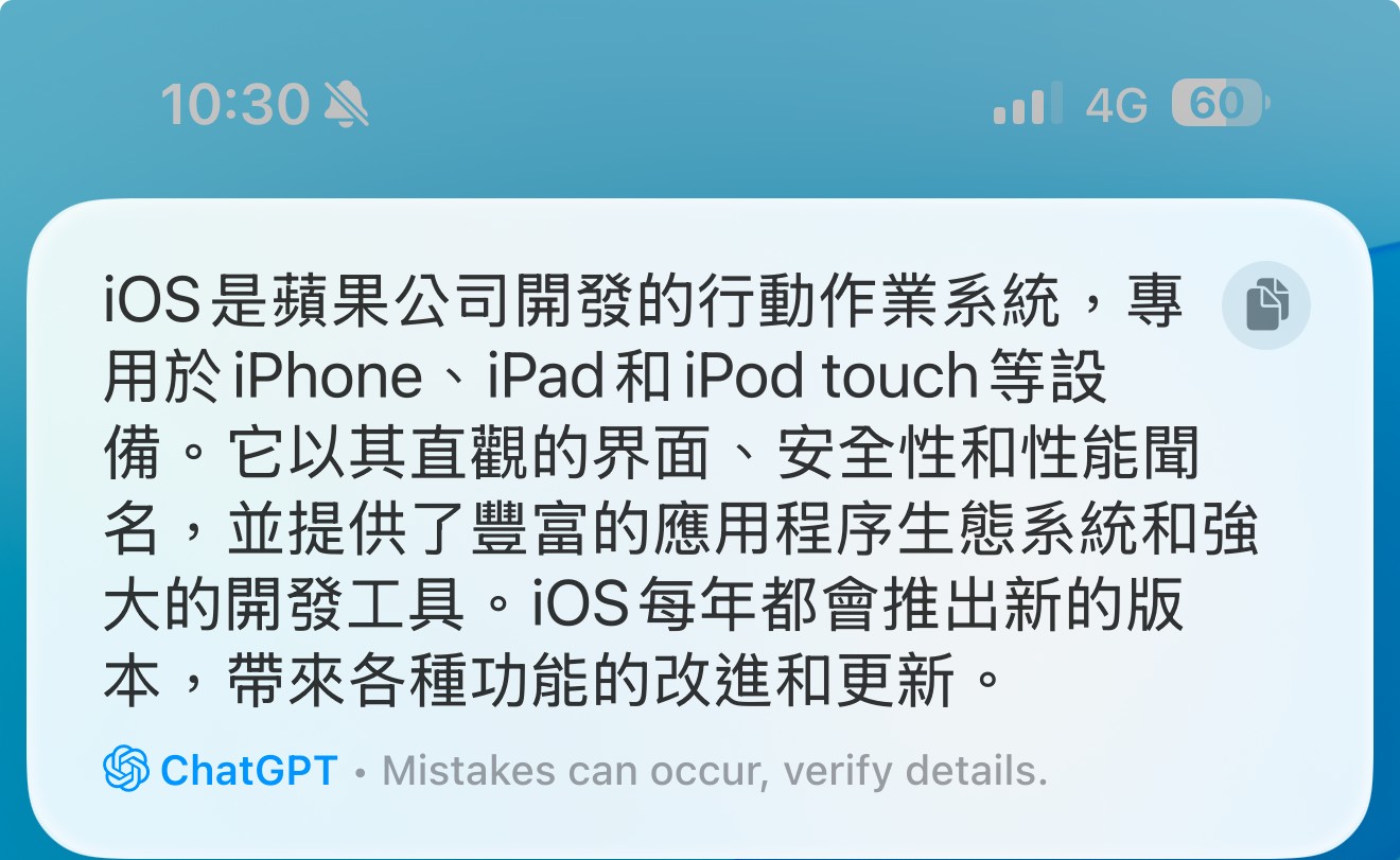 好消息是語言支援很快就會擴充。今年 12 月,系統將新增六個英語地區的在地化版本,包括澳洲、加拿大、愛爾蘭、紐西蘭、南非和英國。明年 4 月起,Apple 將透過軟體更新陸續加入更多語言支援,包括中文、新加坡英文、印度英文,以及法文、德文、義大利文、日文、韓文、葡萄牙文、西班牙文和越南文等多種語言。