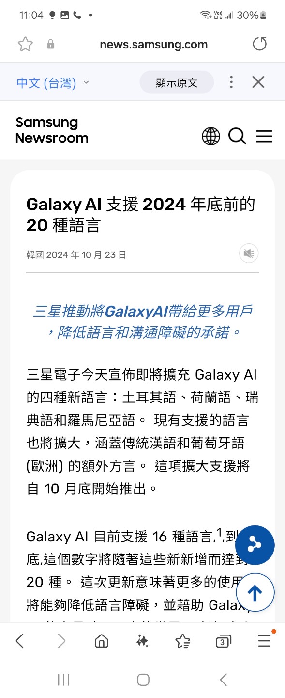 三星近日宣布 Galaxy AI 繁體中文版即將於 10 月底正式上線,只需在「設定」中完成「語言套件」下載,台灣用戶便能體驗更貼近在地需求的智慧服務。