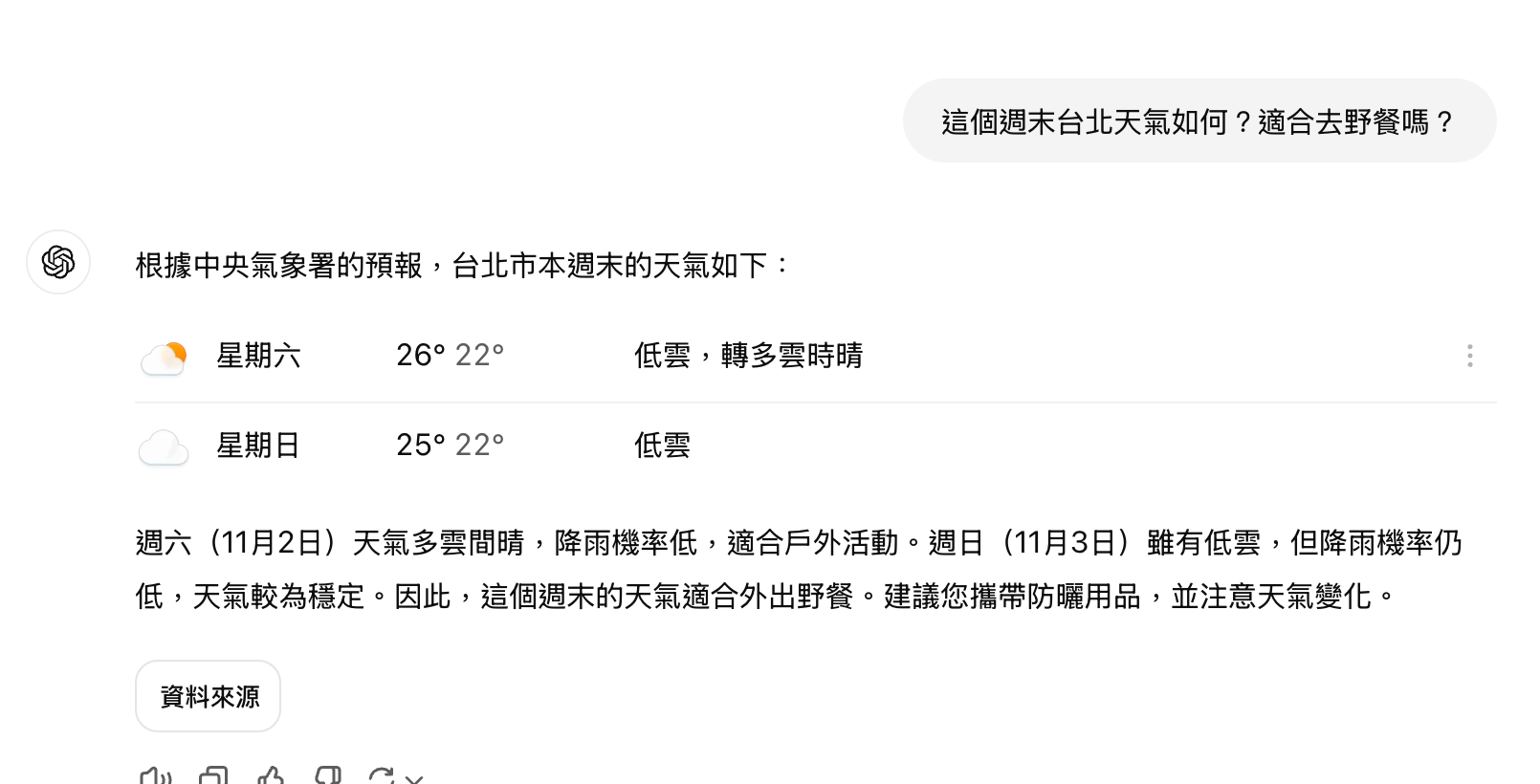 舉個例子來說,你可以這樣問:「這個週末台北天氣如何?適合去野餐嗎?」ChatGPT 會立刻幫你查出天氣預報,還會貼心提醒你要不要帶傘。不只是天氣,股市、新聞、運動賽事,通通難不倒它!
