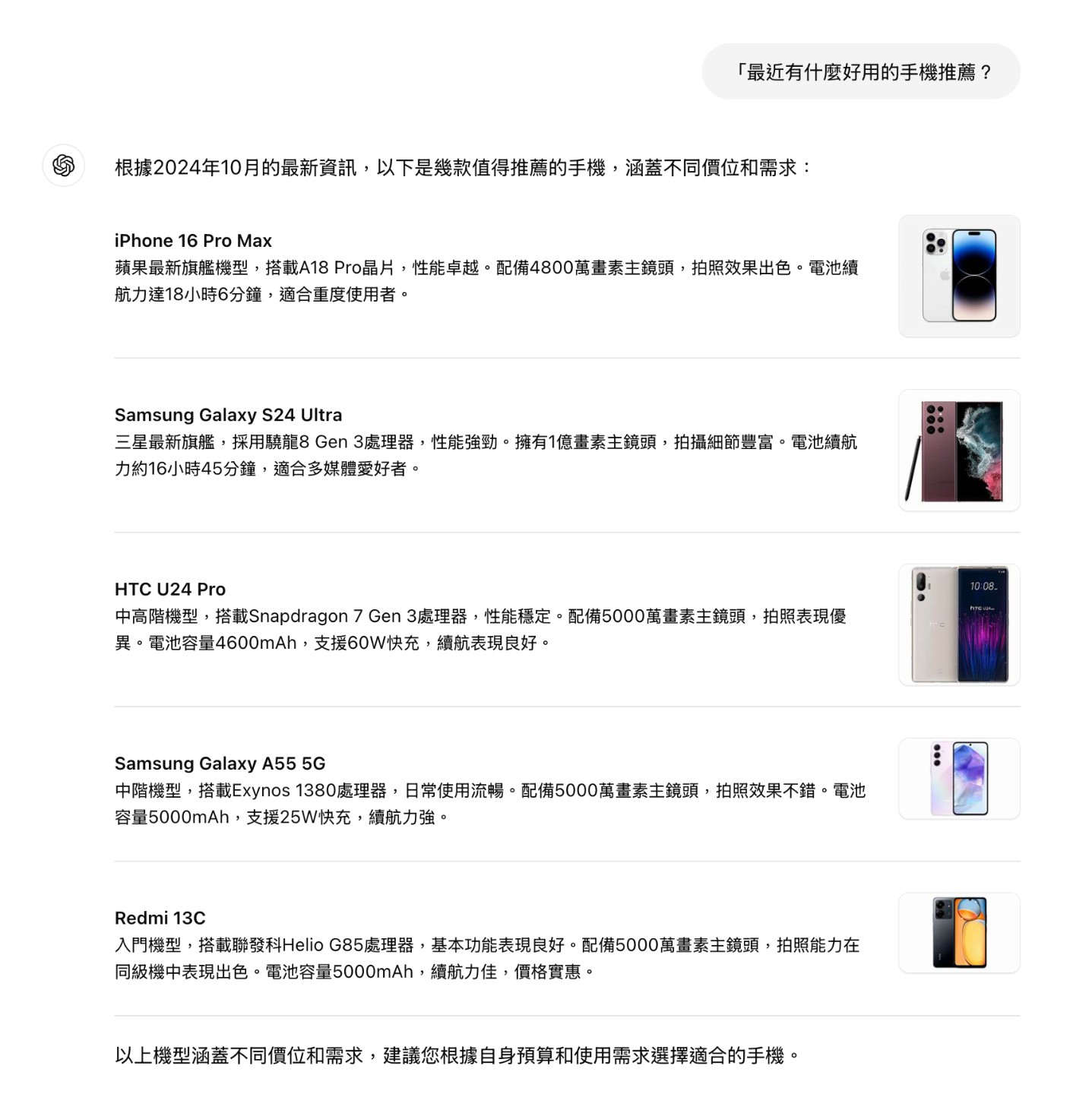 比方說你想買新手機,直接問:「最近有什麼好用的手機推薦?」ChatGPT 會幫你整理最新的手機評測,把優缺點、價格都說得清清楚楚,讓你輕鬆做決定。