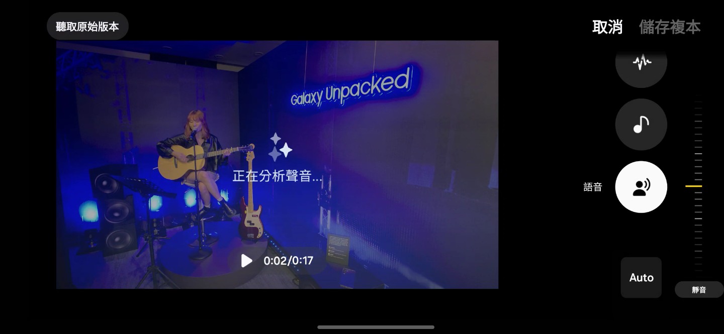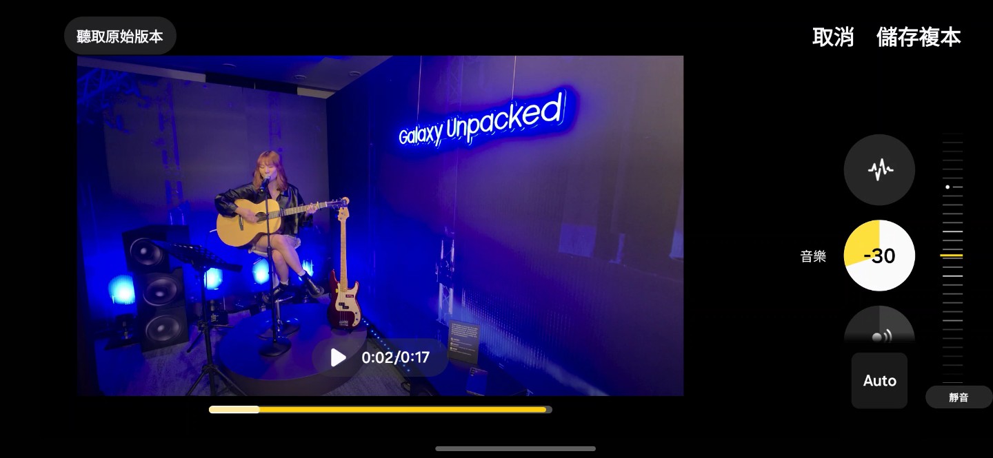 您可以使用螢幕上方的「聽取原始版本」按鈕,隨時切換原始音訊和編輯後音訊,比較兩者之間的差異。您可以根據自己的聽覺感受,選擇最適合的音訊效果。在完成影片音訊的編輯後,只需點擊「儲存複本」按鈕,系統就會將編輯後的影片儲存到您的相簿中。