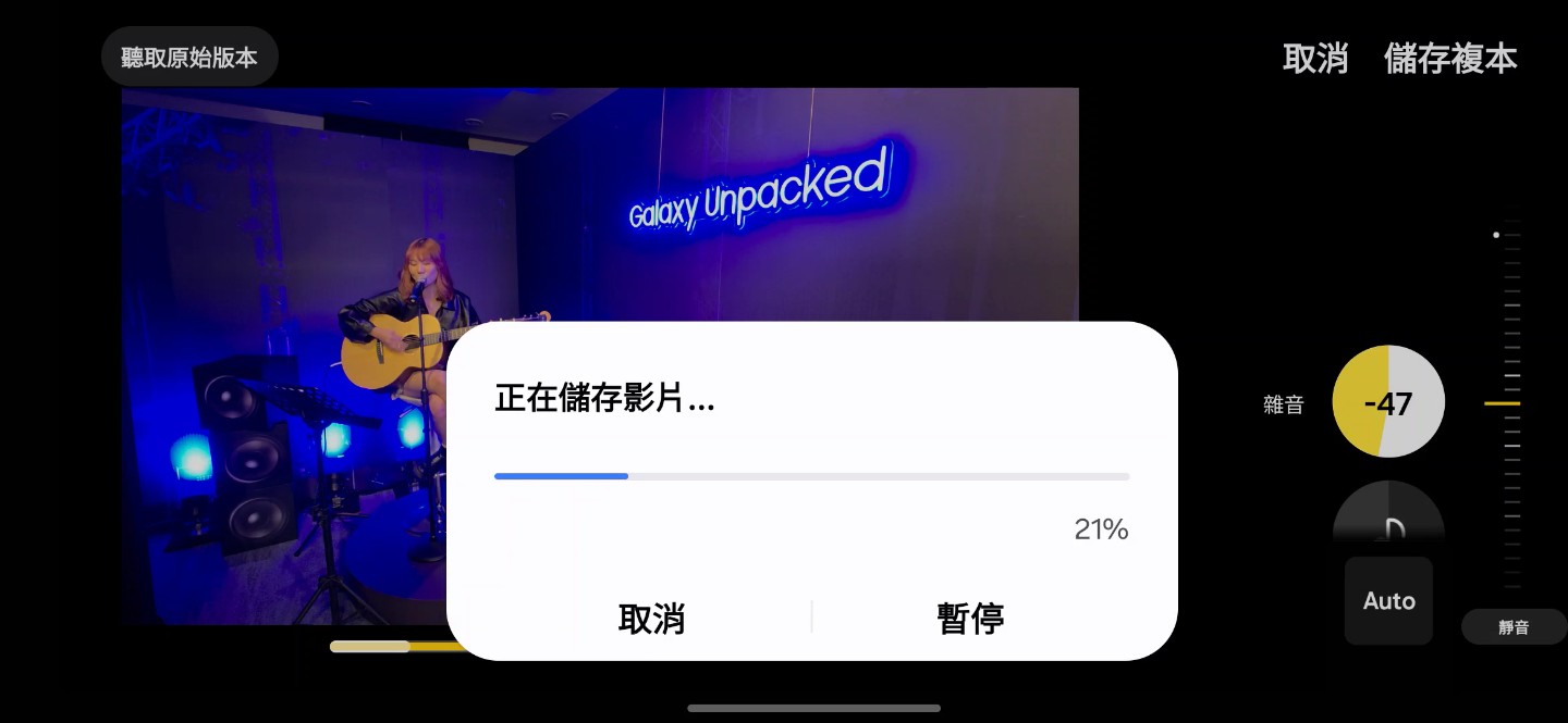 除了「自動」降噪模式之外,Galaxy S25 系列的「音訊橡皮擦」功能,還提供了「手動」調整模式。如果您希望能夠更加精確地控制降噪效果,您可以手動調整雜音的降噪程度。透過滑動畫面下方的調整桿,您可以自由控制雜音的音量,讓影片的音質更加符合您的需求。