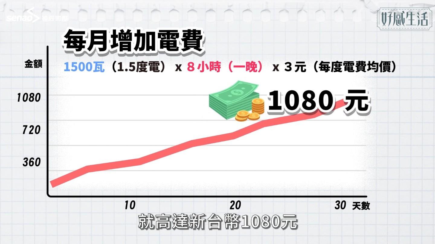 電費試算:( 1,500瓦 / 1,000 ) x 8小時(一個晚上睡眠) x 3塊(假設每度電費均價)