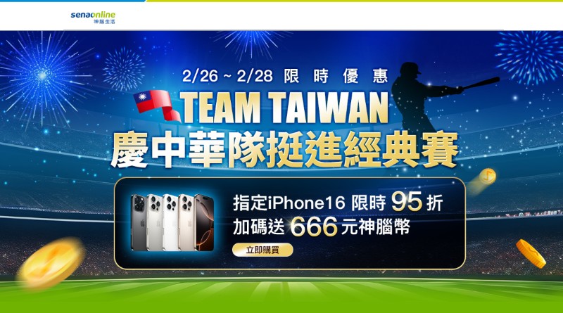 昨晚中華隊戰勝西班牙挺進WBC經典賽,全民熱血沸騰!神腦與國人一同慶祝這份榮耀,網路商城特別推出限時優惠,2月26、27、28日一連三天 iPhone 16 Pro 系列 95 折優惠,再送 666 元神腦幣。蘋果最平價AI手機 iPhone 16e  2月28 日上市,神腦門市指定舊機換新機享 800 元折扣,或是搭配資費最低零元就可入手高CP的AI iPhone!