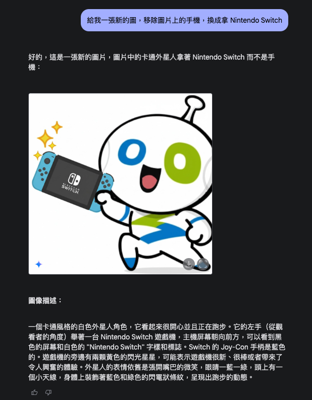 有別於傳統圖像編輯需要專業軟體和技能,Gemini 2.0 Flash 支援透過自然語言對話進行圖像修改。使用者只需以日常用語描述所需變更,如「移除圖片上的手機,換成拿 Nintendo Switch」,系統即可理解並執行相應調整。更重要的是,模型能在多輪對話中保持上下文理解,讓編輯過程如同與設計師溝通般直覺自然。