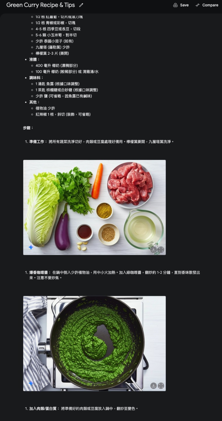 Gemini 2.0 Flash 具備豐富的世界知識和增強推理能力,能夠創建符合現實邏輯的精確圖像。例如,在生成食譜插圖時,模型能理解食材、烹飪流程,並生成符合實際情況的視覺呈現。儘管如此,Google 也坦承,與所有 AI 模型一樣,Gemini 的知識範圍雖廣泛但並非全面,因此在專業領域的應用可能仍需專家指導。(意思是有時候生成的圖片會跟實際有點差距,例如下方範例生成的蔬菜圖就跟食譜文字提到的不一樣)。