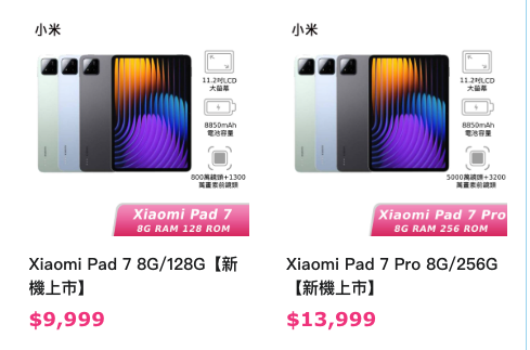 Xiaomi Pad 7 8G/128G 建議售價 9.999 元