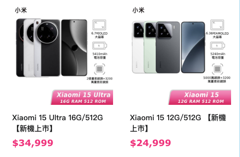 Xiaomi 15 Ultra 16G/512G 建議售價 34,999 元