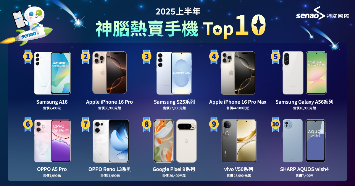 今年各大品牌齊推搭載AI功能的旗艦與中階機種,讓AI應用從高階走向更平民化。神腦公布2025上半年前十大最熱賣手機,價格親民的「三星 Galaxy A16」擠下旗艦機站上熱賣寶座,改寫往年中高階機稱霸的局面。而第二到四名分別是iPhone 16 Pro、三星S25系列、iPhone 16 Pro Max延續高階機的穩定買氣,暢銷中階機三星A56則居第五位,OPPO A5 Pro及輕旗艦Reno 13系列擠進六、七名,第八名則是主打原生Android體驗的Google Pixel 9系列,第九、十名是vivo V50系列、SHARP AQUOS wish4。