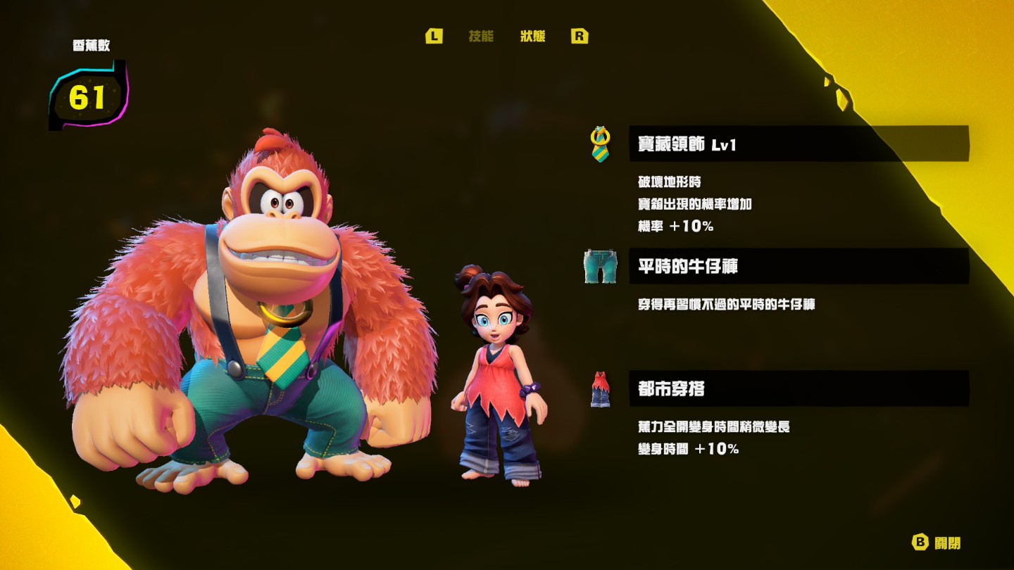 除了基本的能力強化外,遊戲還設計了換裝系統。不同的服裝不僅能改變咚奇剛的外觀,更能賦予他特殊的能力加成。玩家可以根據不同的關卡需求或個人喜好,選擇最適合的裝備搭配。