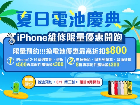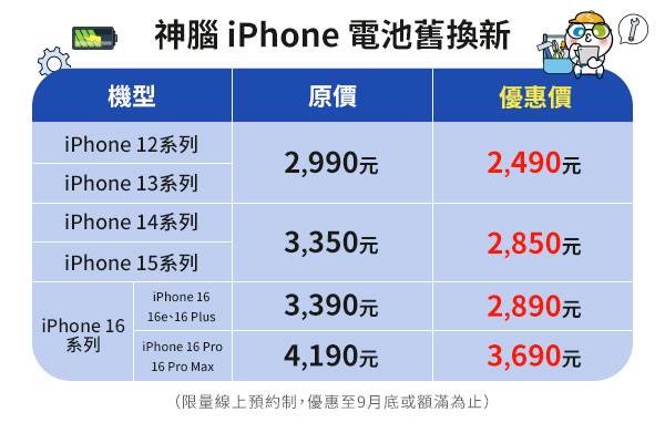 同步針對iPhone限定機型推出螢幕與背面玻璃維修8折優惠。神腦提醒消費者,若手機出現耗電異常、電池健康度低於80%,建議及早預約更換原廠電池,避免影響使用體驗。優惠活動採線上限量預約制,活動只到9月底或換完為止。