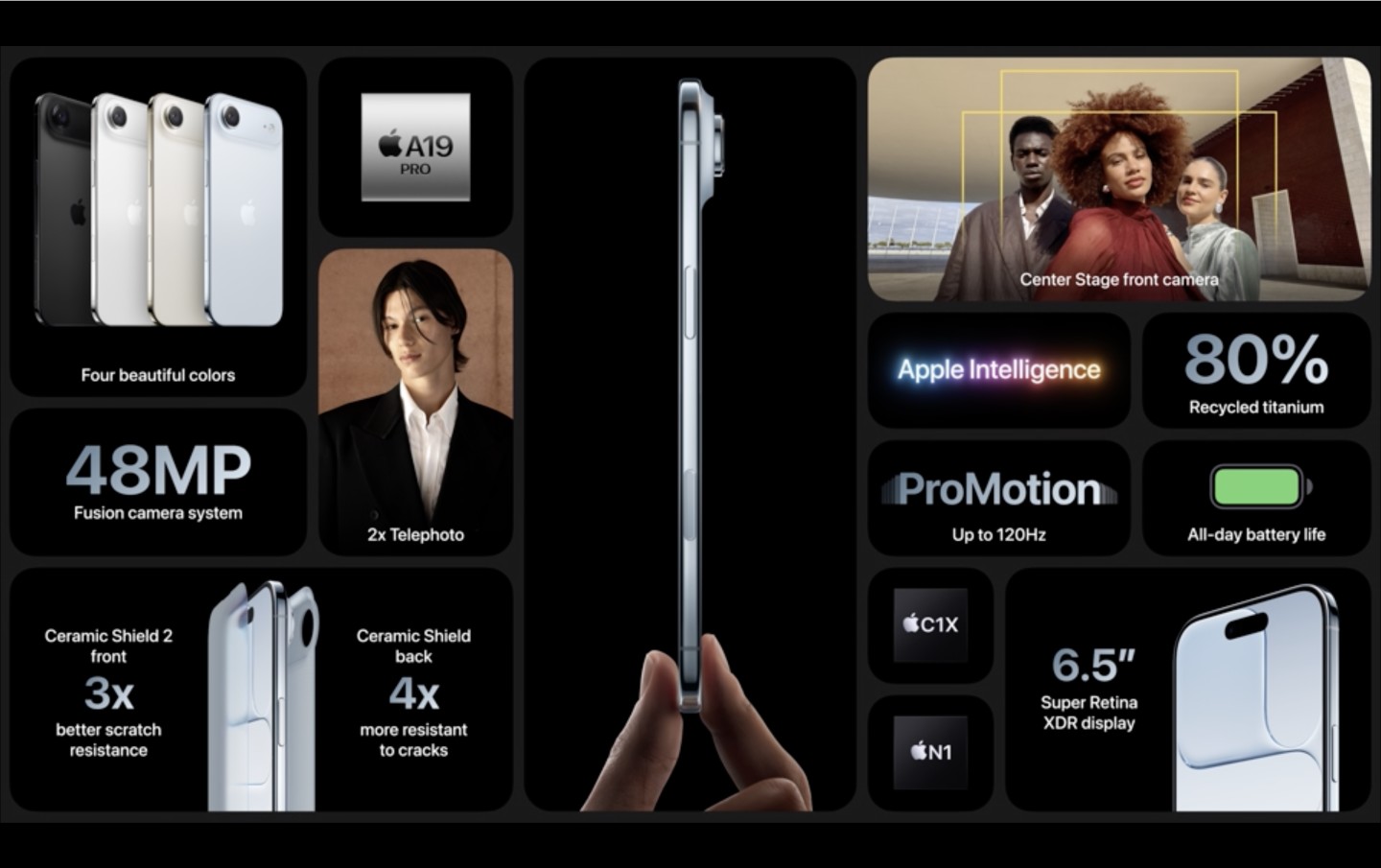 iPhone Air 搭載 6.5 吋 Super Retina XDR 顯示器,支援 ProMotion 技術,提供高達 120Hz 的自適應更新率,讓滑動操作更加流暢自然。顯示器峰值亮度達 3000 nits,是 iPhone 歷來最高亮度,即使在強烈陽光下也能清晰閱讀。全新超瓷晶盾2面板不僅覆蓋正面,更首度保護背面區域,抗刮能力提升 3 倍,抗裂性能較前代產品提升 4 倍。